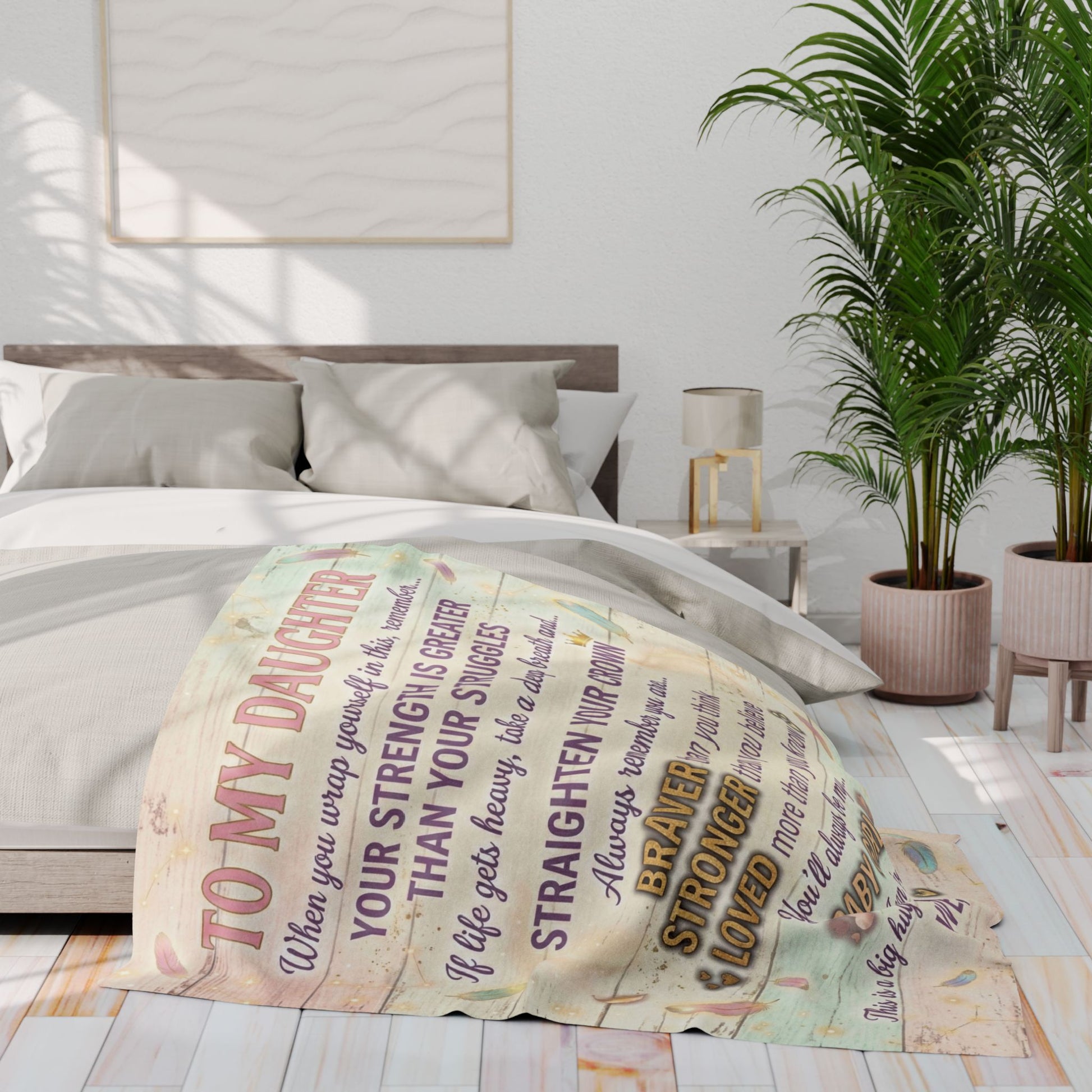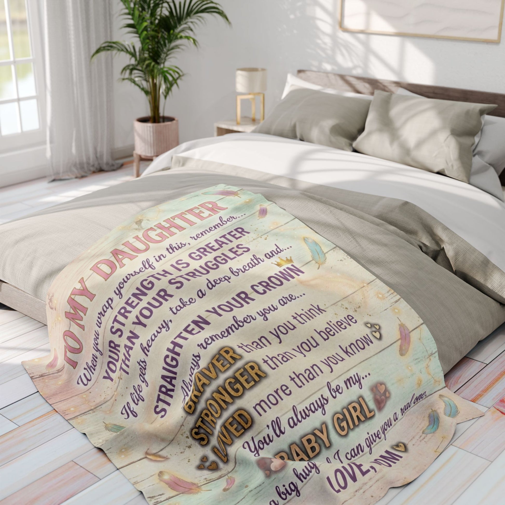 Wrap your daughter in a soft, cozy message that feels like a warm, encouraging hug. This Arctic fleece blanket pairs plush, thick polyester with a gentle pastel design and an uplifting letter-style print that reads like a private note from mom. It brings quiet comfort on chilly evenings, becomes a go-to for bedtime stories or movie nights, and sits ready on the couch when she needs a reminder of strength and love. The faded wood-plank background and feather accents give a rustic, handmade vibe that blends with nursery, bedroom, or living room decor, while the bold, hopeful words remain the focus.